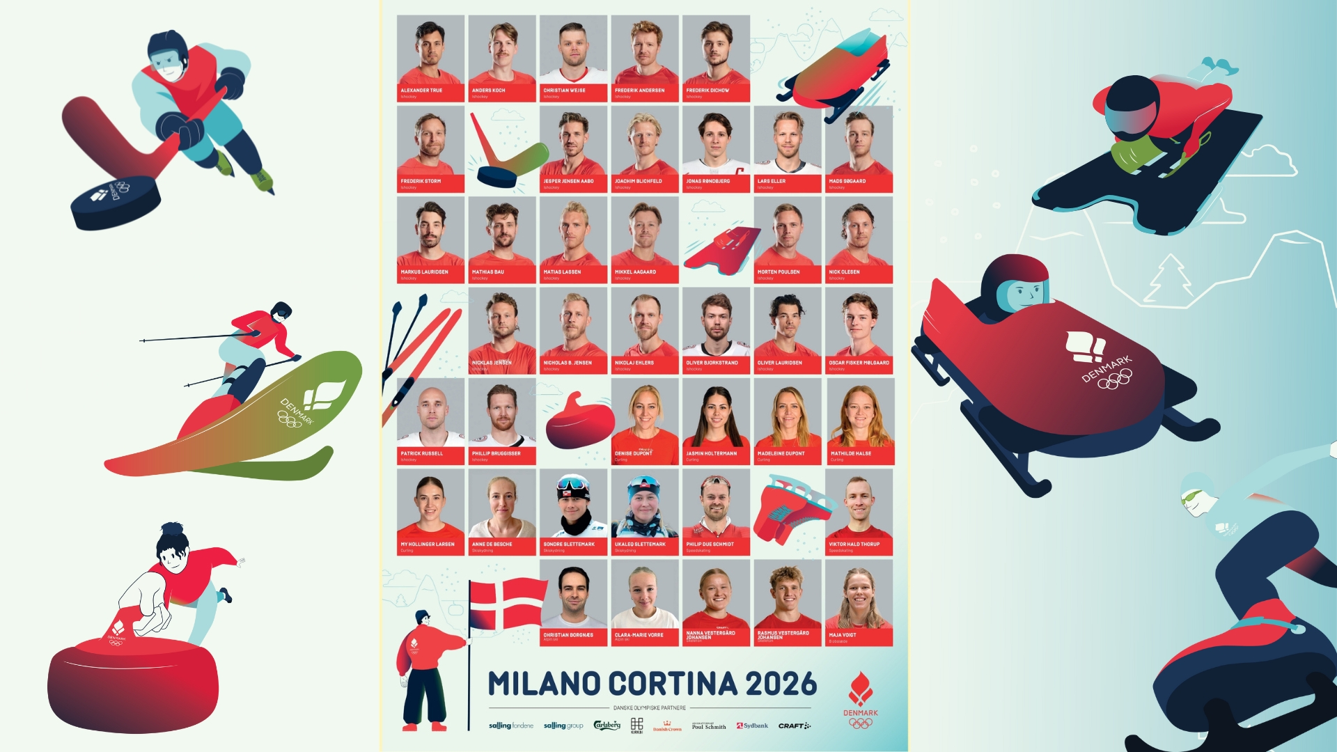 SPORT. Danmark stiller med et markant og bredt sammensat hold, når vinter-OL i 2026 løber af stablen i Milano Cortina. I alt 39 danske atleter er udtaget til legene, hvor de skal konkurrere i syv forskellige idrætsgrene. Det gør truppen til den næststørste, Danmark nogensinde har sendt af sted til et vinter-OL.